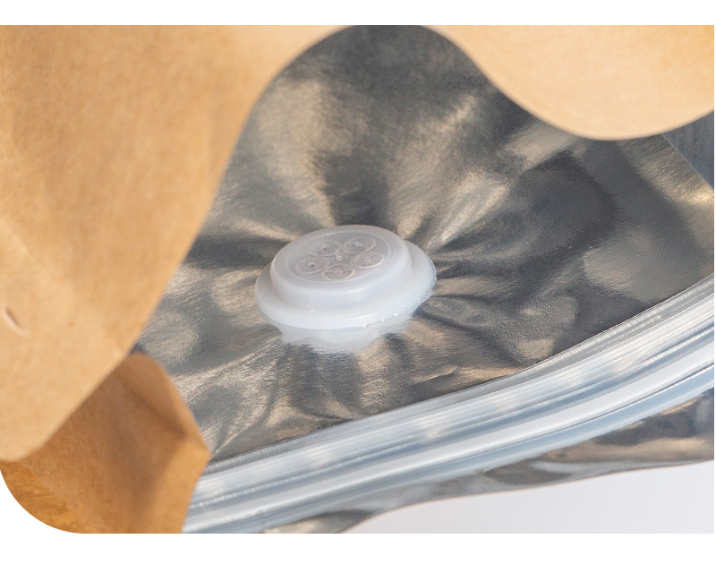 单向排气阀可将二氧化碳排出袋外,并阻止袋外的氧气进入袋内(空气会氧化咖啡豆,使咖啡香气挥发,改变咖啡风味)。空气阀可确保咖啡的新鲜度和质量。